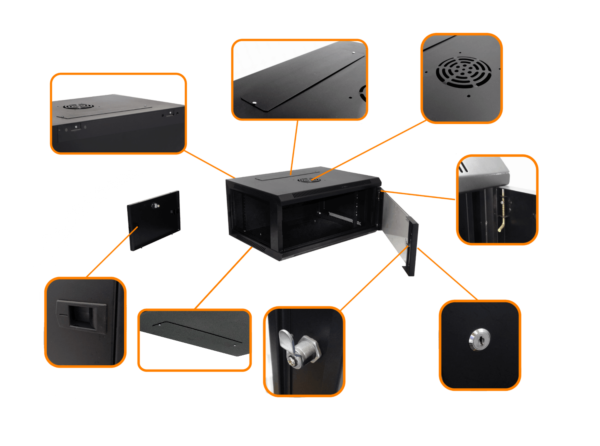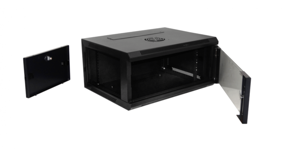 - Rack de 4U con cerradura y puertas laterales y frontal, de alto y 45cms de fondo, con doble marco de fijación ajustable en profundidad, sin ventilador.